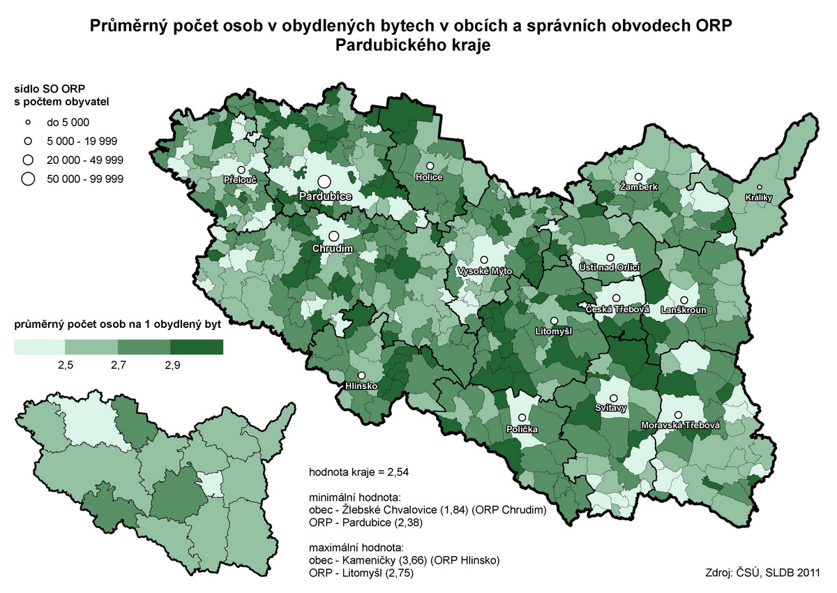 Průměrný počet osob v obydlených bytech v obcích a správních obvodech ORP Pardubického kraje