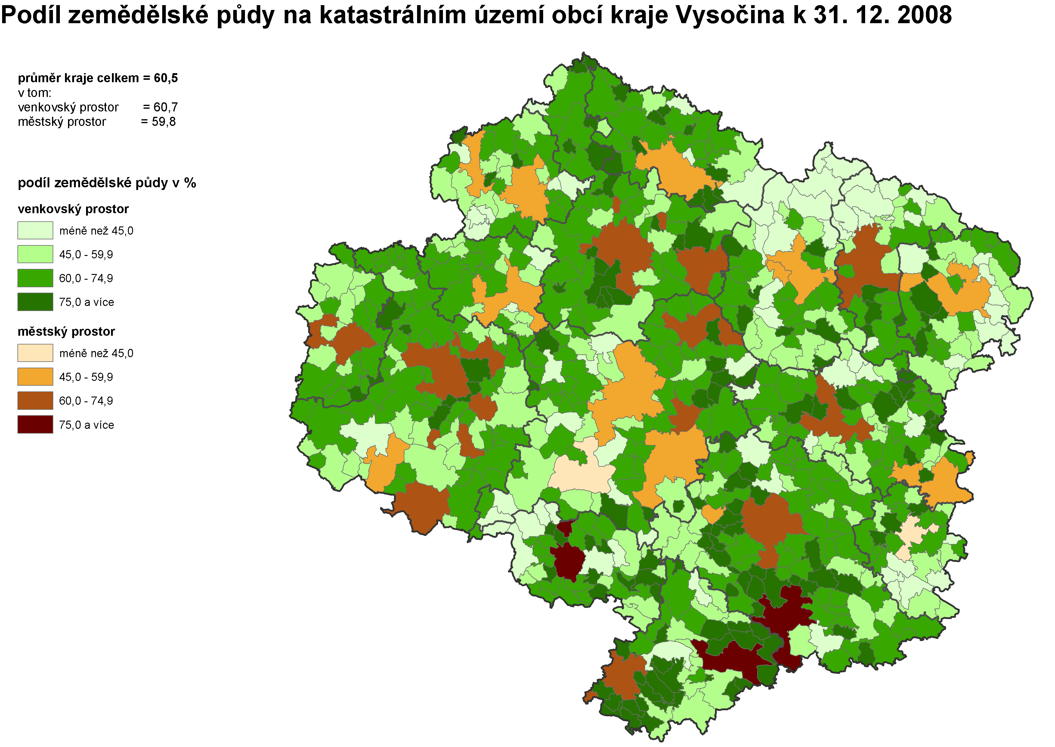 3. Podíl zemědělské půdy na katastrálním území obcí kraje Vysočina k 31. 12. 2008