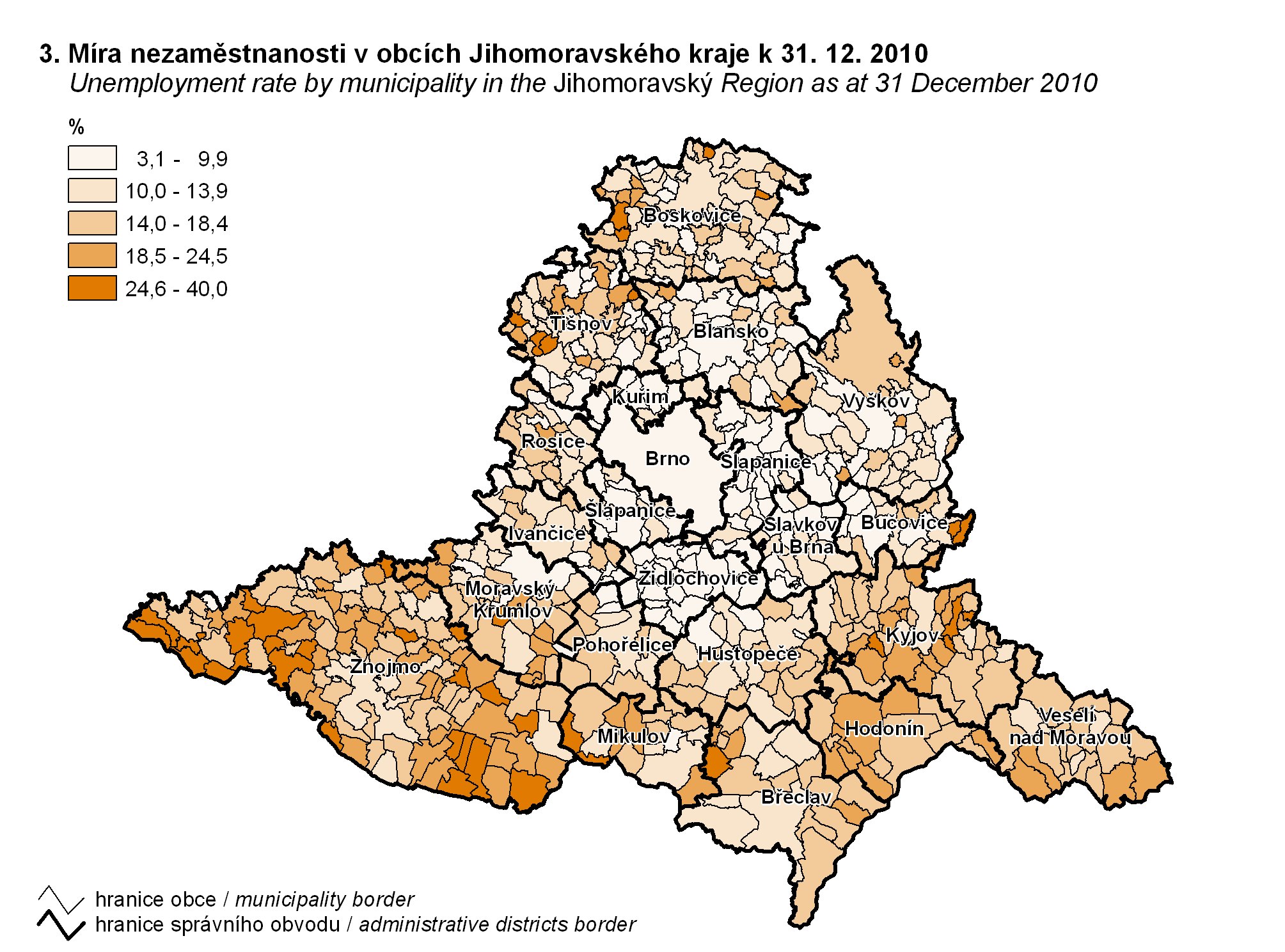 3. Míra nezaměstnanosti v obcích Jihomoravského kraje k 31. 12. 2010
