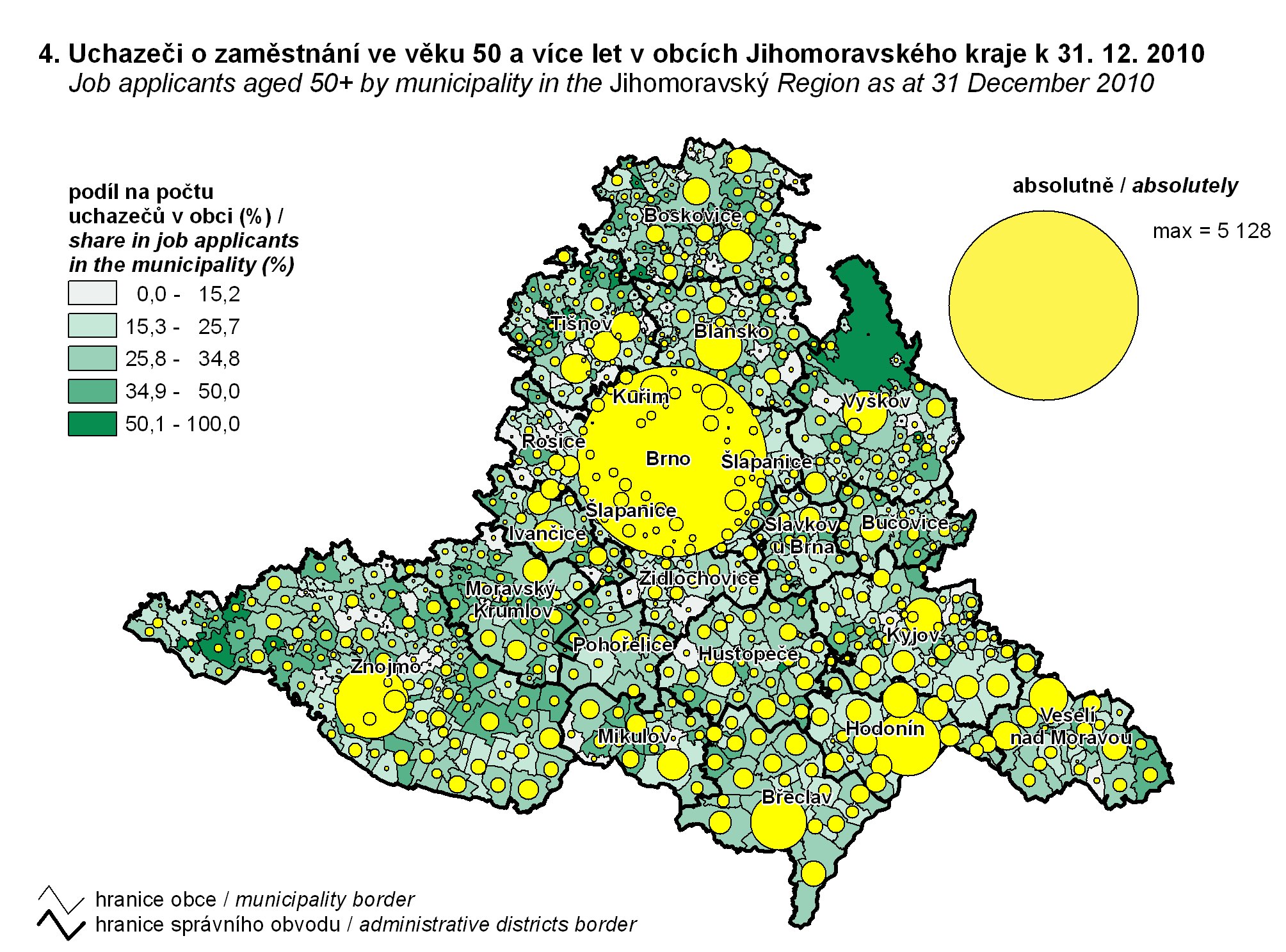 4. Uchazeči o zaměstnání ve věku 50 a více let v obcích Jihomoravského kraje k 31. 12. 2010