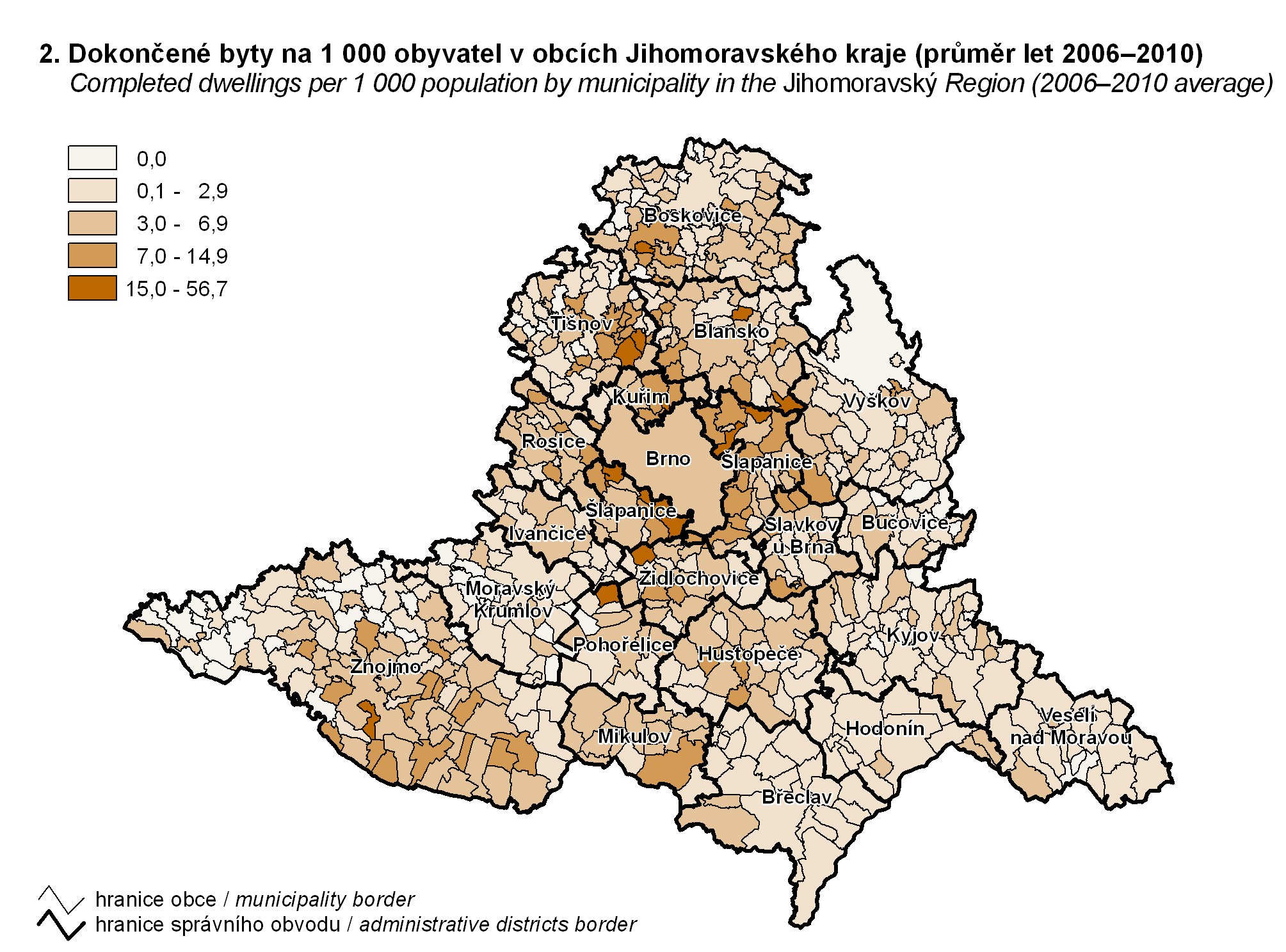 2. Dokončené byty na 1 000 obyvatel v obcích Jihomoravského kraje (průměr let 2006–2010)