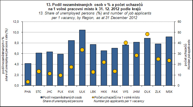 Graf 13. Podíl nezaměstnaných osob v % a počet uchazečů na 1 volné pracovní místo k 31. 12. 2012 podle krajů