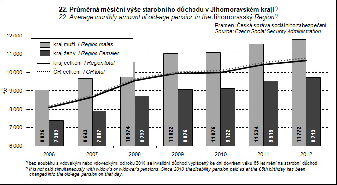 Graf 22. Průměrná měsíční výše starobního důchodu v Jihomoravském kraji
