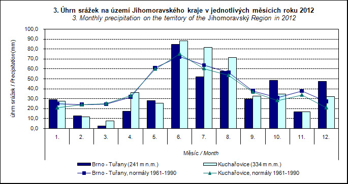 Graf 3. Úhrn srážek na území Jihomoravského kraje v jednotlivých měsících roku 2012