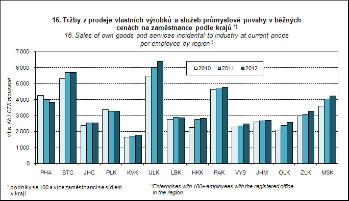 Graf 16. Tržby z prodeje vlastních výrobků a služeb průmyslové povahy v běžných cenách na zaměstnance podle krajů