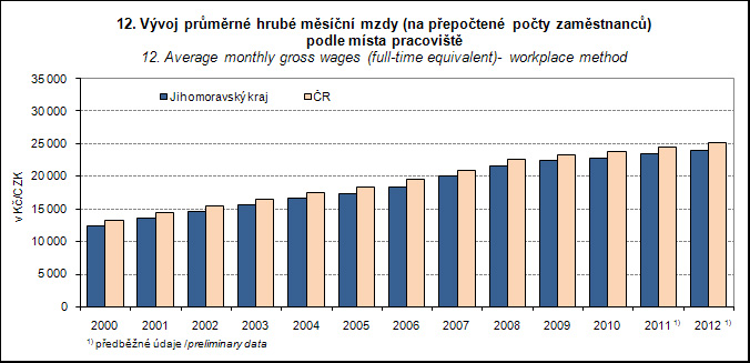 Graf 12. Vývoj průměrné hrubé měsíční mzdy (na přepočtené počty zaměstnanců) podle místa pracoviště