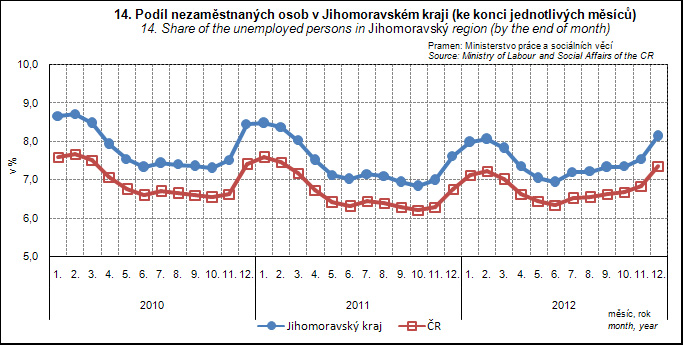 Graf 14. Podíl nezaměstnaných osob v Jihomoravském kraji (ke konci jednotlivých měsíců)