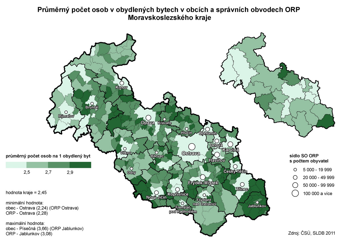 Průměrný počet osob v obydlených bytech v obcích a správních obvodech ORP Moravskoslezského kraje