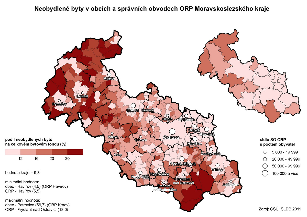 Neobydlené byty v obcích a správních obvodech ORP Moravskoslezského kraje