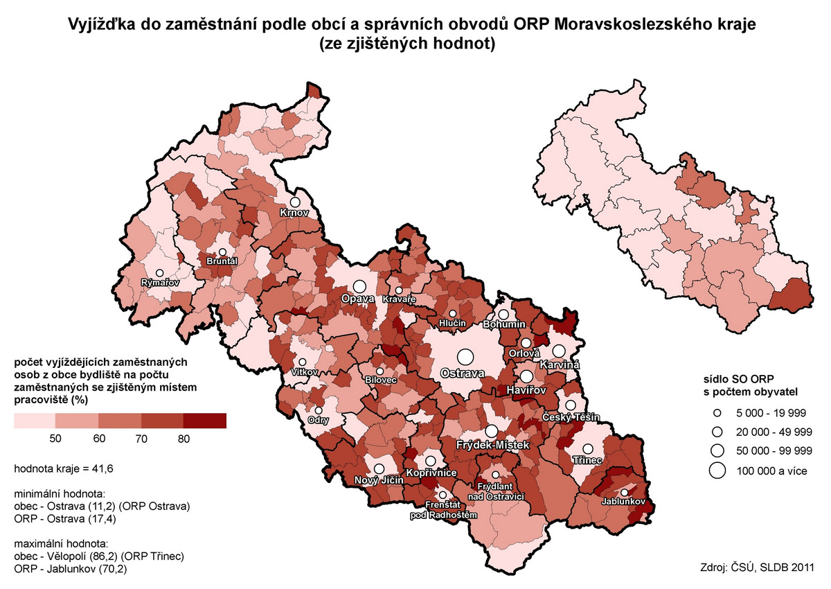 Vyjížďka do zaměstnání podle obcí a správních obvodů ORP Moravskoslezského kraje