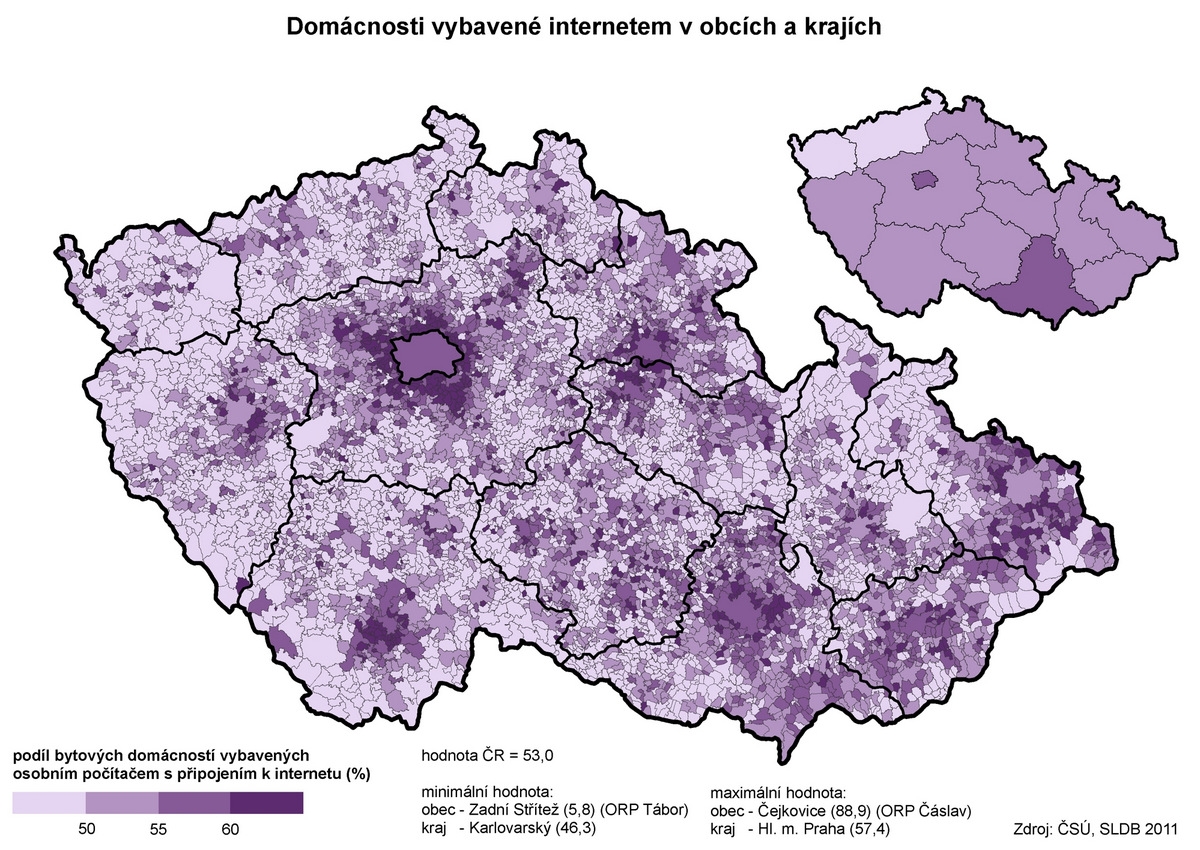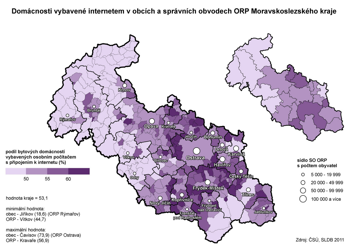 Domácnosti vybavené internetem v obcích a správních obvodech ORP Moravskoslezského kraje