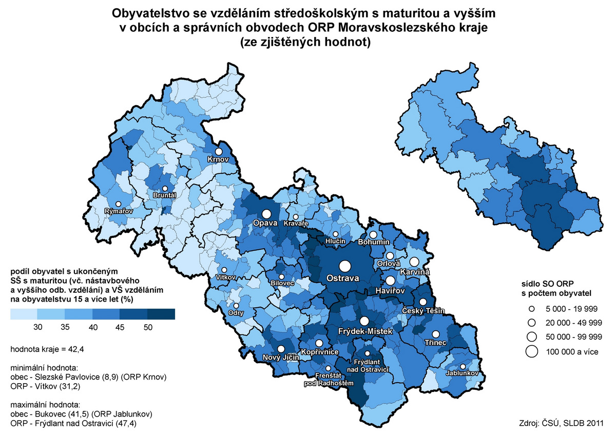 Obyvatelstvo se středoškolským vzděláním s maturitou a vyšším vzděláním v obcích a správních obvodech ORP Moravskoslezského kraje