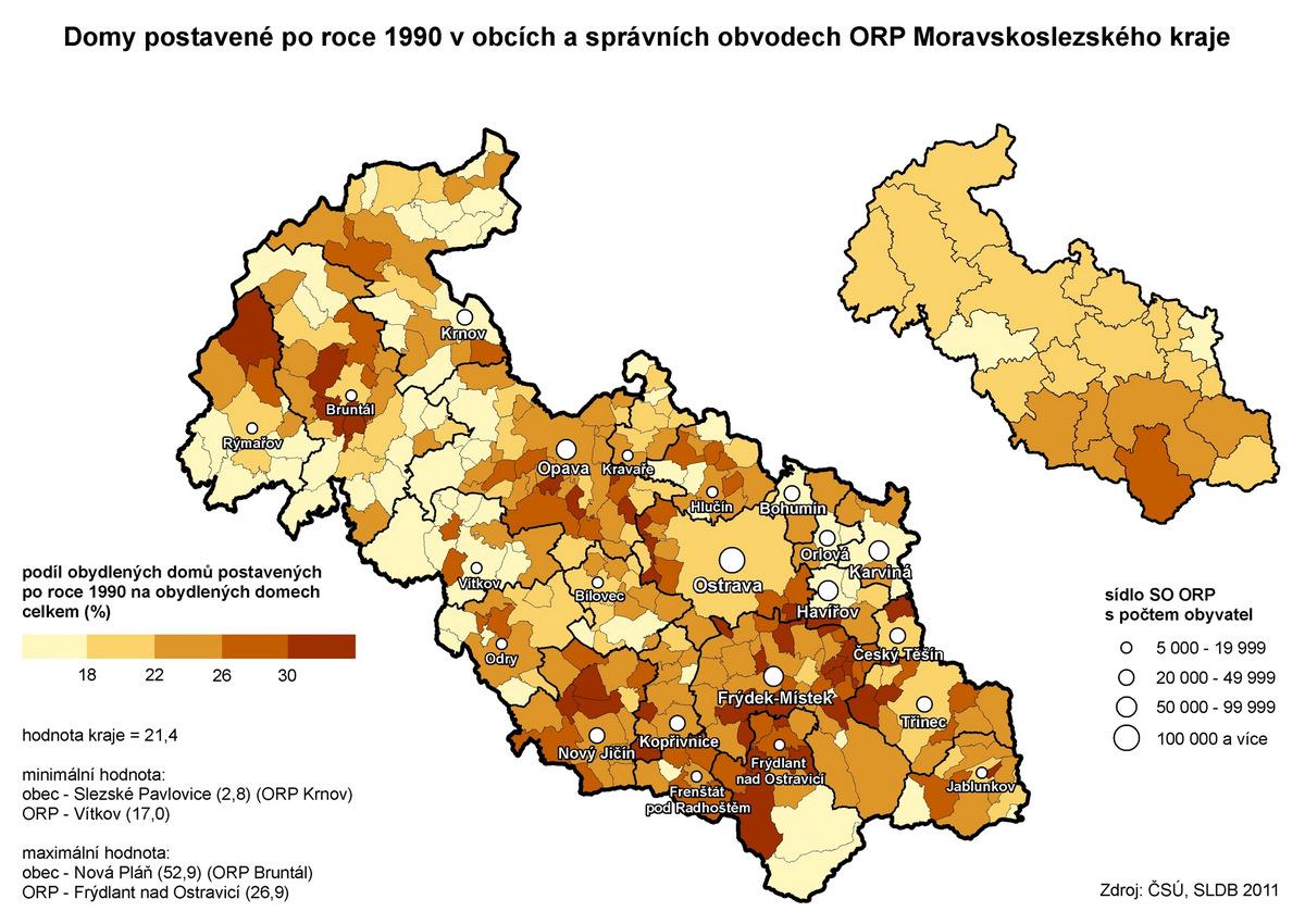 Domy postavené po roce 1990 v obcích a správních obvodech ORP Moravskoslezského kraje