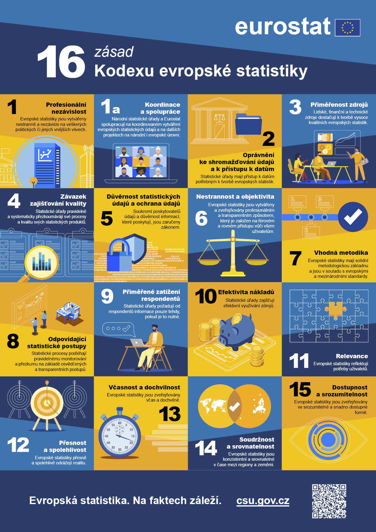 Kodex je základním pilířem pro tvorbu kvalitních, nezávislých a transparentních statistik. Díky němu mají všichni uživatelé jistotu, že oficiální statistiky vznikají profesionálně, spolehlivě a v souladu s mezinárodními zásadami.