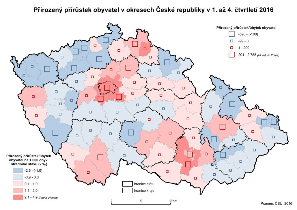 Přirozený přírůstek obyvatel v okresech České republiky v 1. až 4. čtvrtletí 2016