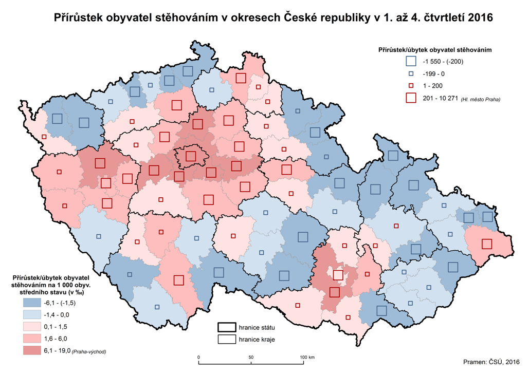 Přírůstek obyvatel stěhováním v okresech České republiky v 1. až 4. čtvrtletí 2016