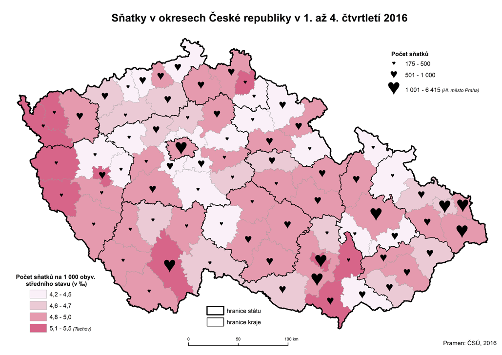 Sňatky v okresech České republiky v 1. až 4. čtvrtletí 2016