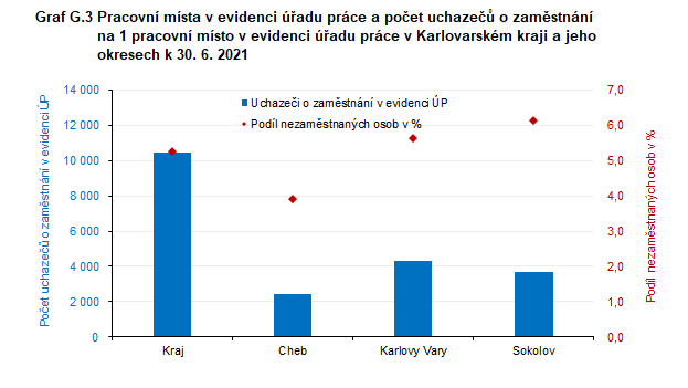 Graf G.3 Pracovní místa v evidenci úřadu práce a počet uchazečů o zaměstnání na 1 pracovní místo v evidenci úřadu práce v Karlovarském kraji a jeho okresech k 30. 6. 2021