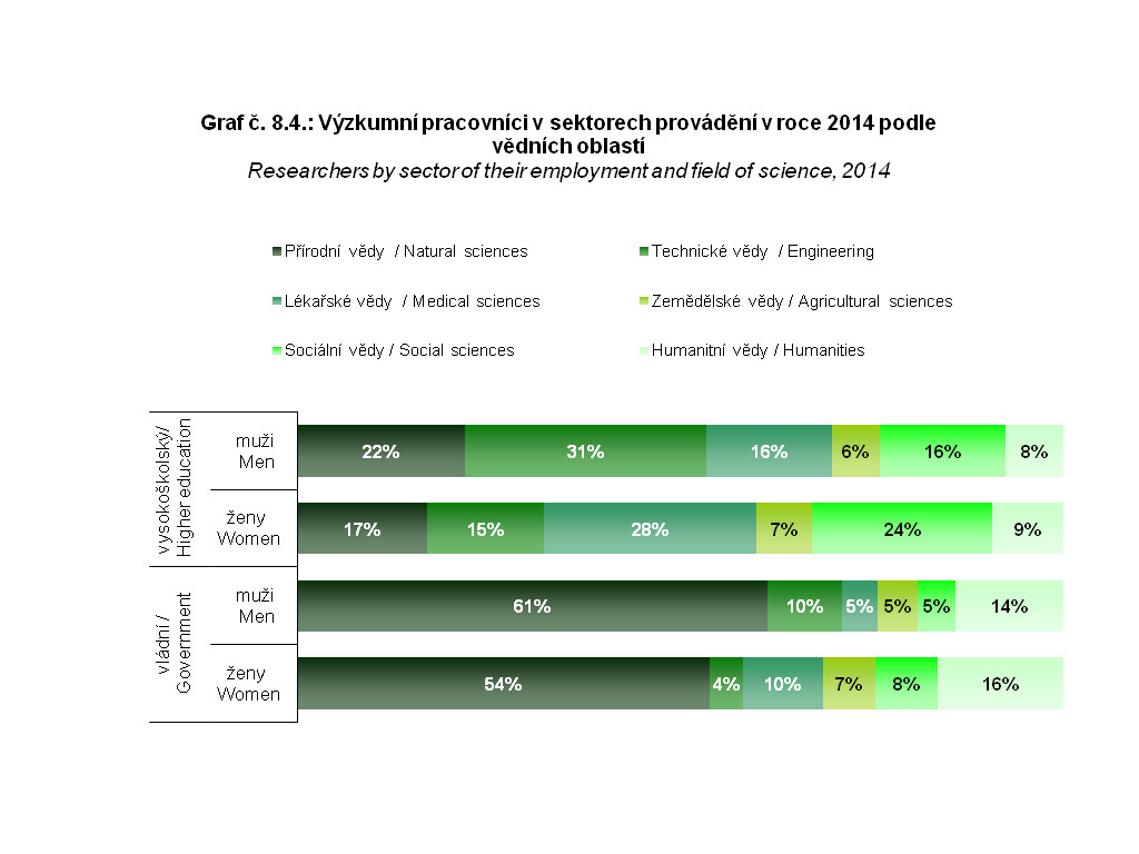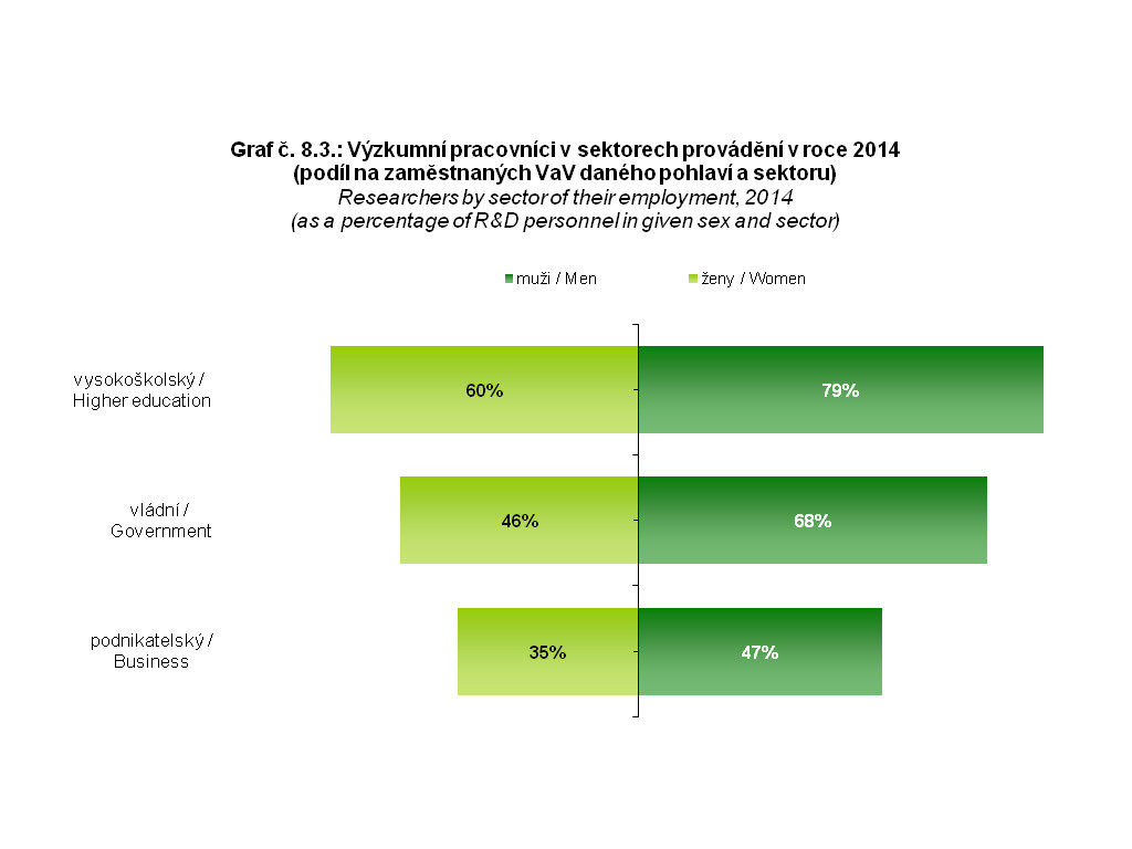 8.3. Výzkumní pracovníci v sektorech provádění v roce 2014 (podíl na zaměstnaných VaV daného pohlaví a sektoru)