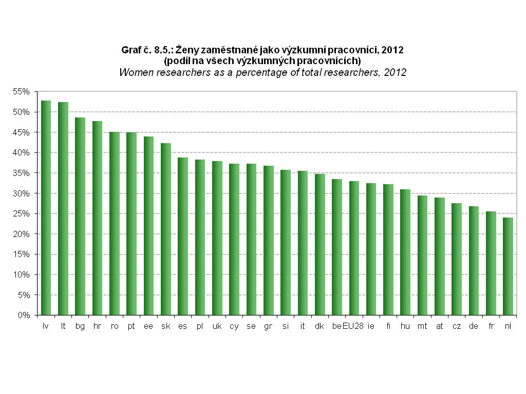 8.5. Ženy zaměstnané jako výzkumní pracovníci, 2012 (podíl na všech výzkumných pracovnících)