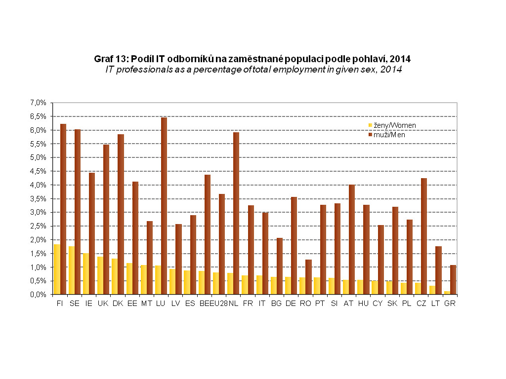 9.13. Podíl IT odborníků na zaměstnané populaci podle pohlaví, 2014
