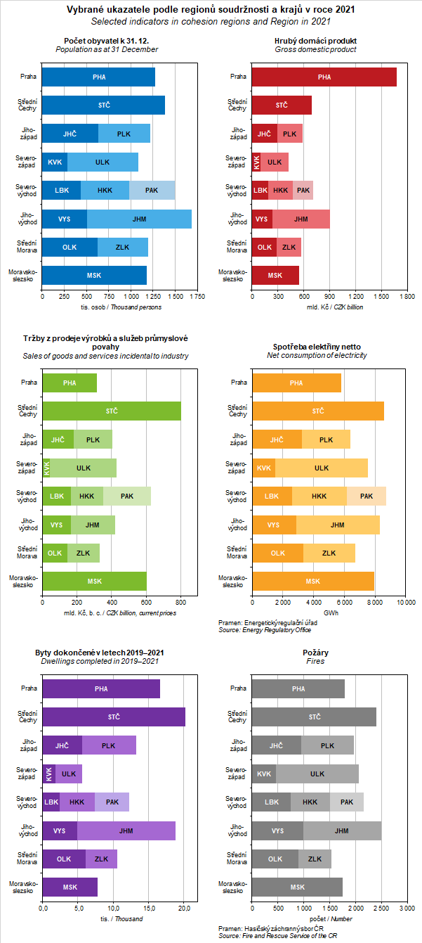 Graf 28-1. Vybrané ukazatele podle regionů soudržnosti a krajů v roce 2021
