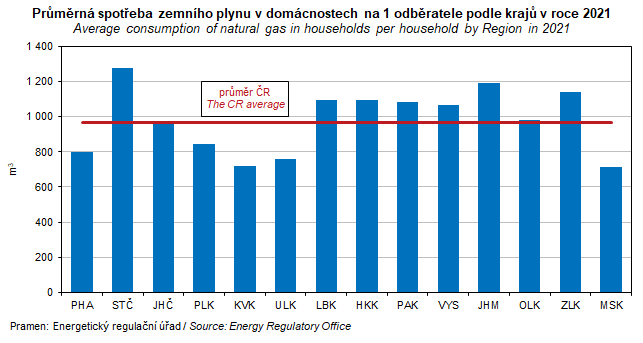 Graf 14-2. Průměrná spotřeba zemního plynu v domácnostech na 1 odběratele podle krajů v roce 2021
