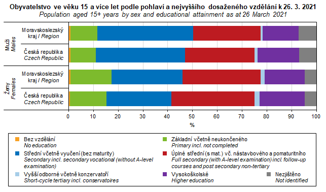 Graf 26-1. Obyvatelstvo ve věku 15 a více let podle pohlaví a nejvyššího dosaženého vzdělání k 26. 3. 2021