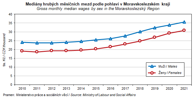 Graf 9-7. Mediány hrubých měsíčních mezd podle pohlaví v Moravskoslezském kraji
