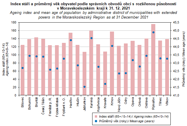Graf 27-2. Index stáří a průměrný věk obyvatel podle správních obvodů obcí s rozšířenou působností v Moravskoslezském kraji k 31. 12. 2021