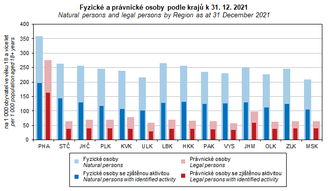 Graf 10-2. Fyzické a právnické osoby podle krajů k 31. 12. 2021