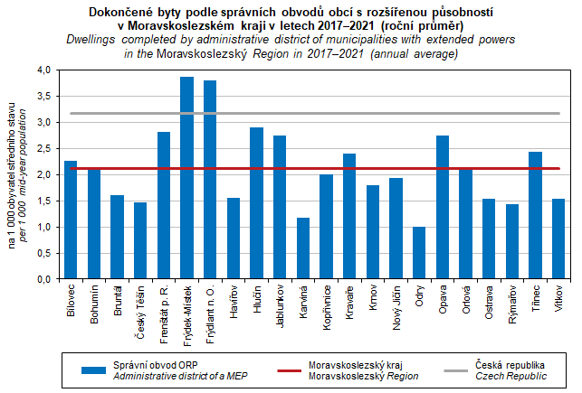 Graf 27-4. Dokončené byty podle správních obvodů obcí s rozšířenou působností v Moravskoslezském kraji v letech 2017–2021 (roční průměr)