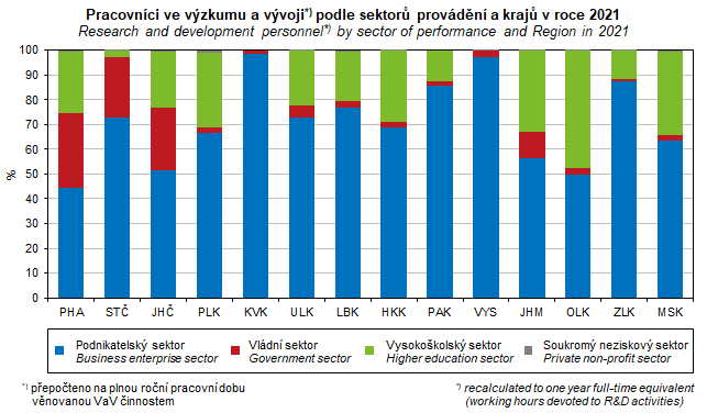 Graf 19-1. Pracovníci ve výzkumu a vývoji podle sektorů provádění a krajů v roce 2021