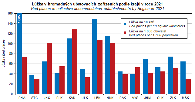 Graf 16-2. Lůžka v hromadných ubytovacích zařízeních podle krajů v roce 2021