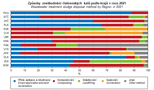 Graf 3-4. Způsoby zneškodnění čistírenských kalů podle krajů v roce 2021