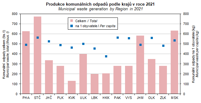 Graf 3-2. Produkce komunálních odpadů celkem podle krajů v roce 2021
