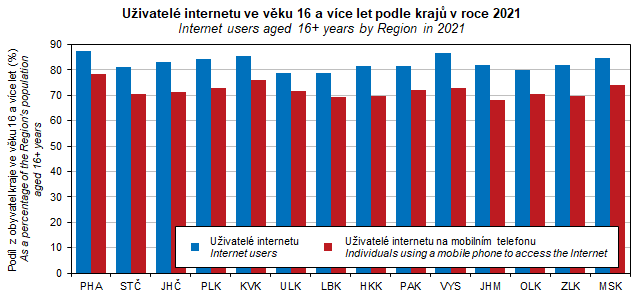 Graf 18-2. Uživatelé internetu ve věku 16 a více let podle krajů v roce 2021