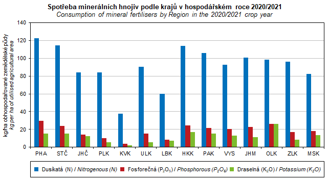Graf 11-2. Spotřeba minerálních hnojiv podle krajů v hospodářském roce 2020/2021