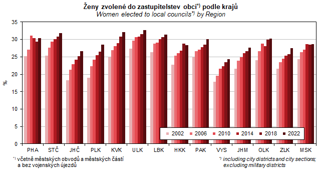 Graf 25-2. Ženy zvolené do zastupitelstev obcí podle krajů