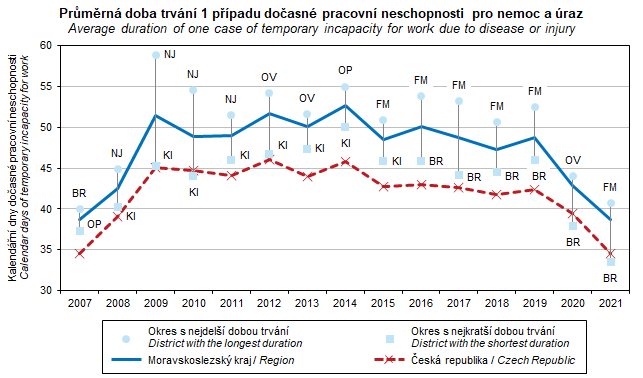 Graf 21-2. Průměrná doba trvání 1 případu dočasné pracovní neschopnosti pro nemoc a úraz
