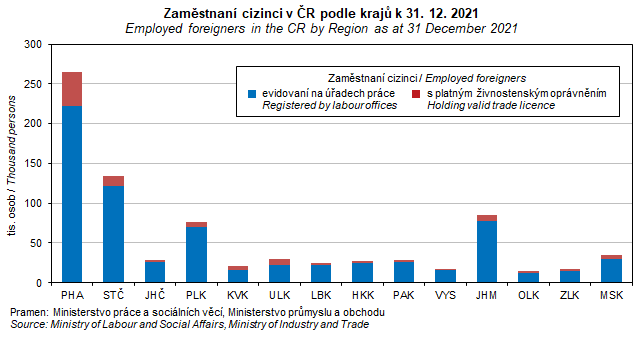 Graf 9-8. Zaměstnaní cizinci v ČR podle krajů k 31. 12. 2021
