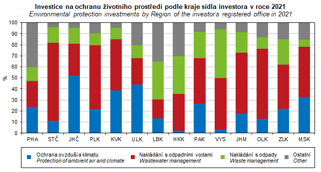 Graf 3-1. Investice na ochranu životního prostředí podle kraje sídla investora v roce 2021