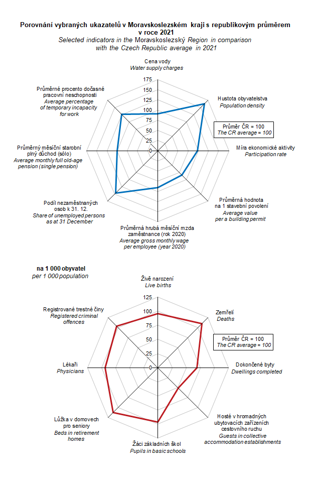 Graf 1-1. Porovnání vybraných ukazatelů Moravskoslezského kraje s celorepublikovým průměrem v roce 2021