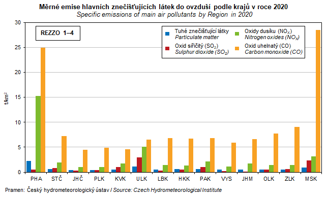 Graf 3-3. Měrné emise hlavních znečišťujících látek do ovzduší podle krajů v roce 2020