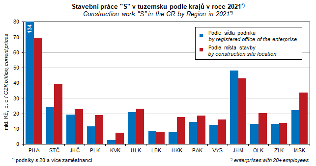 Graf 15-1. Stavební práce "S" v tuzemsku podle krajů v roce 2021