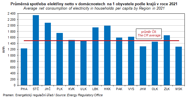 Graf 14-1. Průměrná spotřeba elektřiny netto v domácnostech na 1 obyvatele podle krajů v roce 2021