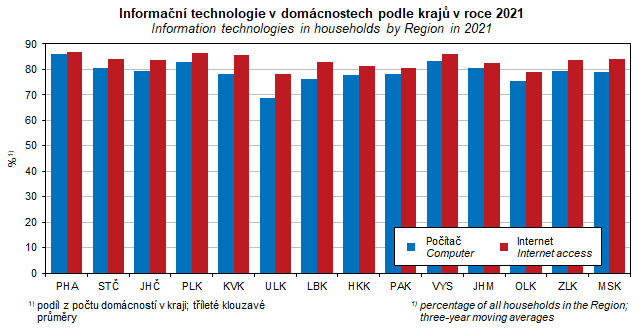 Graf 18-1. Informační technologie v domácnostech podle krajů v roce 2021
