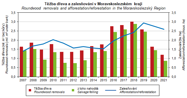 Graf 12-1. Těžba dřeva a zalesňování v Moravskoslezském kraji