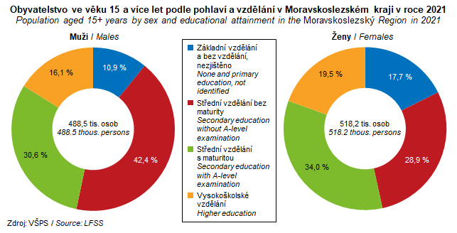 Graf 9-2. Obyvatelstvo ve věku 15 a více let podle pohlaví a vzdělání v Moravskoslezském kraji v roce 2021