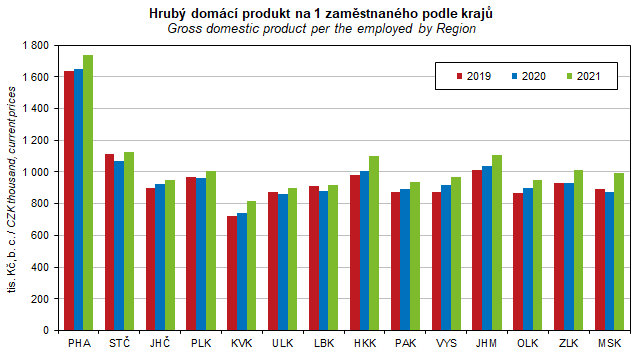 Graf 5-2. Hrubý domácí produkt na 1 zaměstnaného podle krajů